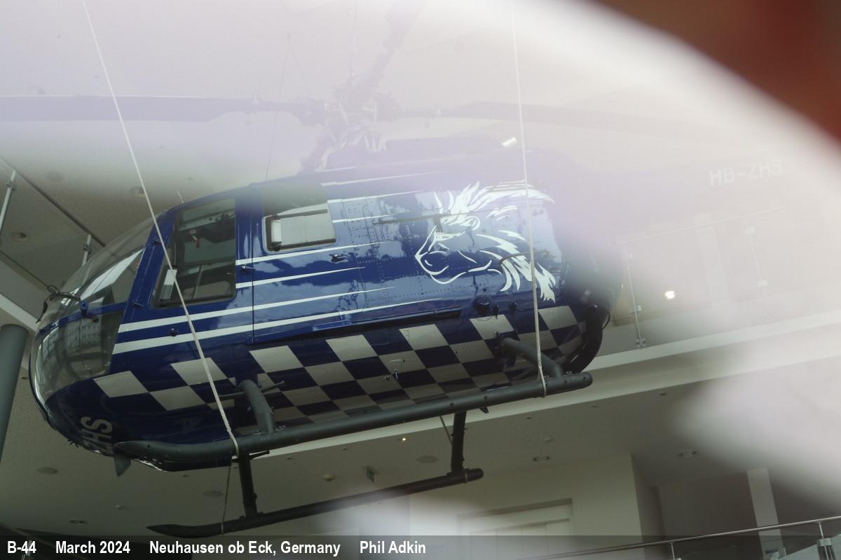 | B-44 | Bolkow Bo.105 CB | Ex KLu, marked as 'HB-ZHS' - serial requires confirmation | Preserved, inside | Mar 2024 | |